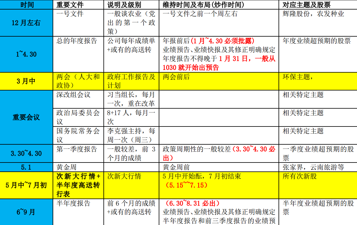 首先,我先给大家列一下年度投资的时间总表,当然这个表按照以往固定的思维给出的,还可以参照我此前的文章:年中经济工作会议前瞻一:我是怎么跟踪政策的,有一些主题比如高送转去年以来受到监管打击,表现已经明显淡化。