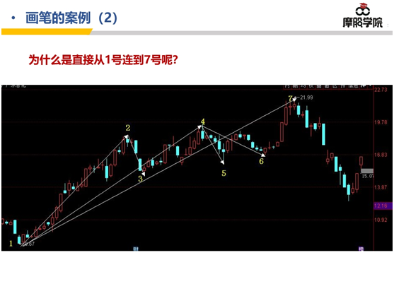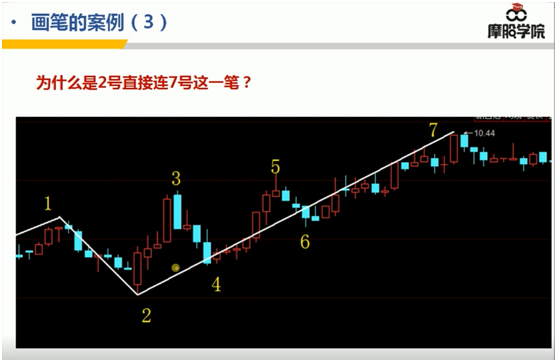 1号到5号是够5根K线的可以连成上涨笔,但5号到6号,这里不够5根K线,那么,只能等延伸: