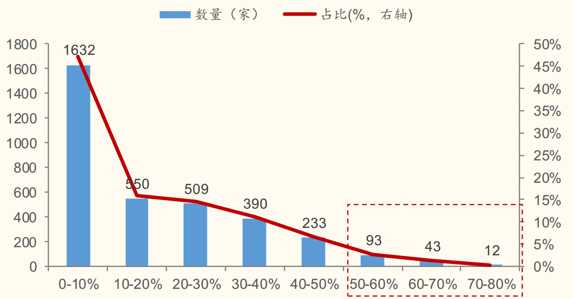 从质押比例的分布来看,截至8月17日,目前A股中质押比例低于10%的股票最多,共有1632只,占比为47.14%。质押比例超过50%的有148只,占比为4.27%。
