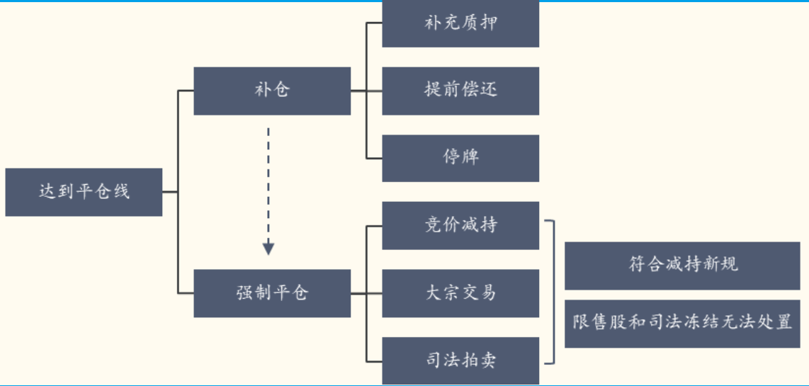 说完股权质押的总体概况,下面说一说大家最关心的问题,股权质押风险怎么规避?首先我用一张图给大家展示一下股票质押平仓处理办法: