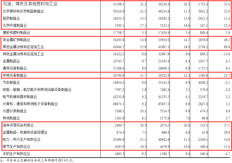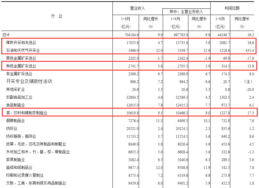 具体到行业中,也能看出一些端倪,下面的图中我把利润总额同比增长是2位数以上的行业用红色框框标出来了。