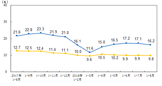 2018年1-8月分经济类型主营业务收入与利润总额同比增速