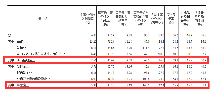 可以看出,这里最大的反差就在于国有控股企业和私营企业的利润增速的差别。如果从经营效益来看,国企的主营业务收入利润率明显高于私营企业,与此同时,私营企业是各种类型企业里每百元主营业务中的成本最高的。