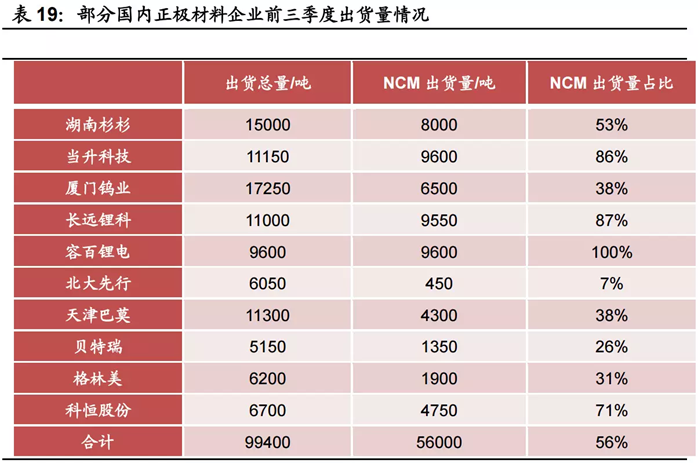 下图是国内正极材料企业前三季度出货量情况,上市公司中当升科技高镍化占比最高,技术优势加拥抱国内外知名客户,和比亚迪的合作已经开始放量,新建产能正在快马加鞭,目前正极材料产能1.6万吨,19年新增1.8万吨,远景10万吨+项目有序进行之中。