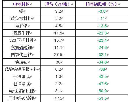 便于理解行业乱战格局,下表统计了2018年初到现在主要电池材料价格跌幅,其中镍和负极材料相对平稳,电解液和六氟磷酸锂去年已经提前跌,2018年跌幅较小,最上游的锂钴资源和隔膜是跌幅最惨的,基本腰斩。