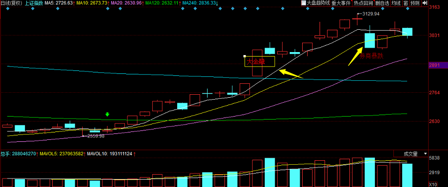 2月25日大金融板块带领上证指数收出一根5.6%的超级大阳线后确立了本轮小牛市的展开,指数随后9个交易日就突破了3100点。上证指数迅速突破3100点后,监管层和操盘的主力军就通过中国人保和中信证券的跌停给市场降温,于是有了3月8号上证指数的大阴线。