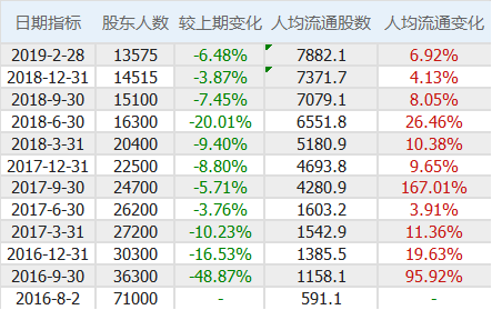 2016年上市之初股东户数7万,基本是人均500股的节奏,然后于2016年年末下降到3万户,之后每个季度只减不增,尤其2018Q2下降20%,随后Q3下降7.5%,Q4下降3.87%,截止2019年2月末再次下降6.47%,只剩下1.36万户,人均持股7882股(如下图),持股高度集中。