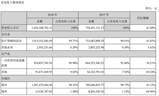 [摘要] 2018年营业收入10.17亿,同比增长41.48%,净利润4.02亿,同比增长41.34%。同时预计2019年1季度净利润1.17亿-1.35亿,同比变动30%-50%。 增长要点: ①2018年,HA130血液灌流器销售收入约为66127.85万元,同比增长44.09%。 ②2018年,主要肝病产品BS330血液灌流器销售收入约为4478.01 万元,同比增长74.19%。 ③海外销售收入同比增长69.90%,扩大到34个国家,并且产品在越南、伊朗、土耳其纳入了医保。 公司在主营血液灌流耗材的基础上大力拓展血液净化设备类产品的销售,设备类产品销售收入同比增长85.92%。