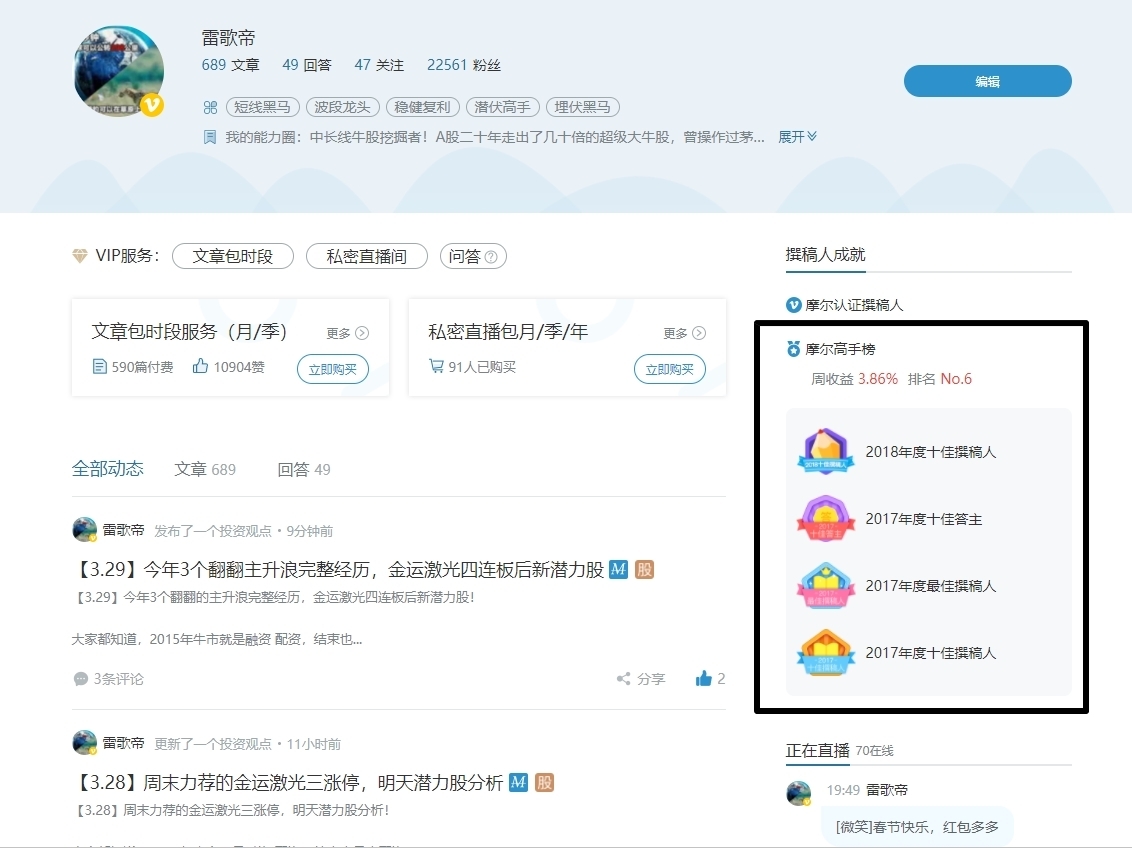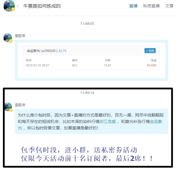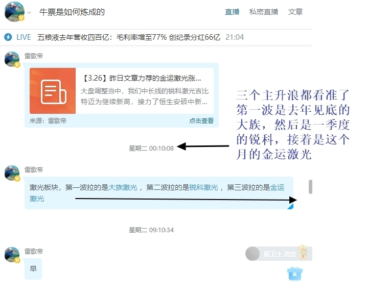 [摘要] 周贴包含下周所有帖子内容,相对还是比较超值的,另外欢迎大家包时段或者包私密直播。 https://www.moer.cn/front/users/profile?uid=111251151 三个今年接近翻翻的主升浪我都看准了,第一波是去年见底的大族,然后是一季度的锐科,接着是这个月的金运激光,后面继续挖掘这类主升浪的个股,供大家投资参考。 后市展望 :后期会坚守高价高送转含权预期股,但也会逐渐逢低吸纳一些中价优质成长股。