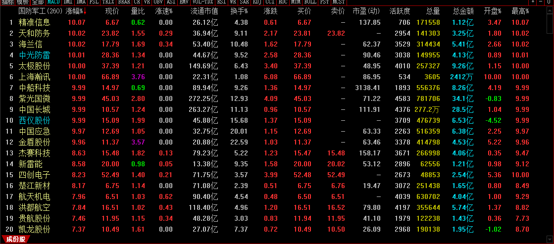 强势:中国应急300527 精准信息300099 中船科技600072 天和防务300397 中国长城000066 亚星锚链601890;
