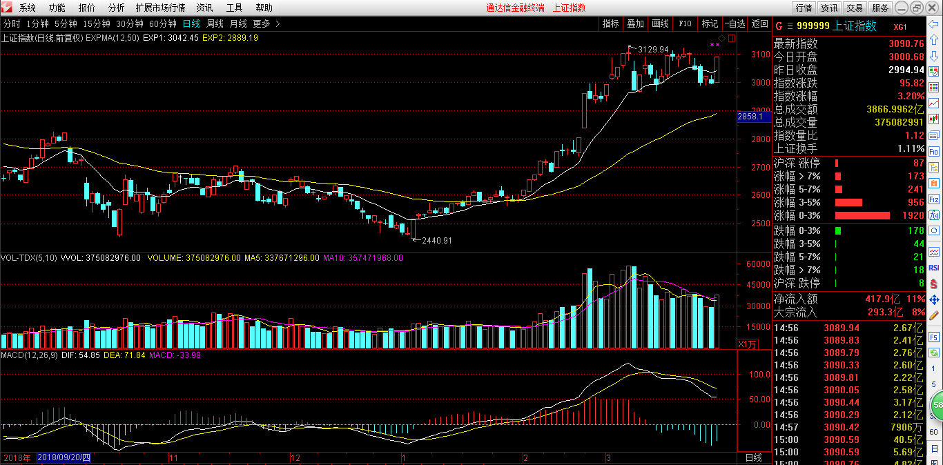 大盘3100点久攻不破,前高一线十字星不断,出现的变盘信号在没有突破之前都不可轻易忽视。顶背离一直都在,成交量的不足也成为指数进一步创新高的隐患,消息面利好刺激导致市场过度的反应,也不能瞬间消化和修复技术层面的堪忧。券商为首的大金融强势反抽,题材四面开花两市普涨,跟不上的成交量持续性从何而来?