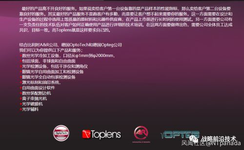 “用精密光学的技术,打造独特光学设备”的宗旨是公司能立足于市场,满足于客户需求的根本。每年的大投入研发使公司的产品不断涌现,在彻底了解光学行业特点和每个客户特殊要求的基础上,走在技术革新的前沿,不断引导光学加工和检测的发展方向,Toplens公司有能力研发能为行业带来新思想、新理念的新型光学检测设备和加工机械。