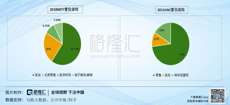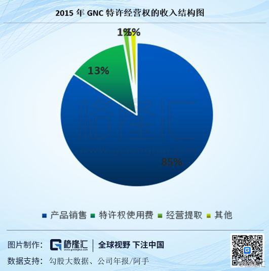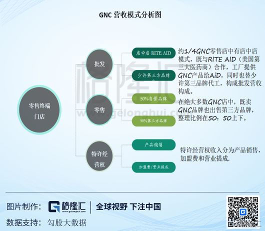 GNC主要营收来源依靠终端门店,比较形象的例子就是保健品行业中的苏宁,虽然营收模式多样化,但除了电子商务外,所有营收模式全部源自于终端门店所辐射出的业务模式。