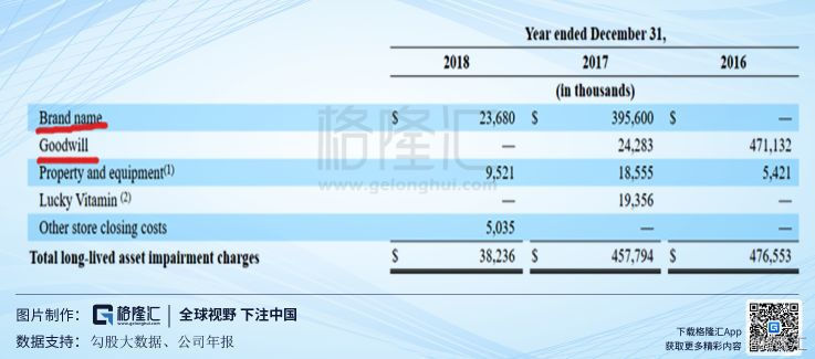 以上出自GNC的年报,阿手将其翻译成中文。我们看到标红的数字是长期资产减值,2016及2017年吃掉了9亿的净利润!令人费解的是长期资产减值的大头是品牌和商誉(Brandname和GOODWILL)!小部分才是设备减值,门店倒闭费用等。