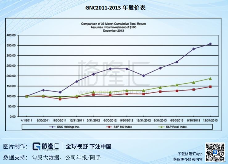 GNC是一家拥有80多年的保健品历史,其业务包含VHMS(膳食类保健品),运动类保健品及其他。90年代曾在美国上市后退市,2011年二度上市,其股价和业绩在上市初始时被誉为美国最具投资价值标的之一,2年多时间涨幅250%以上。
