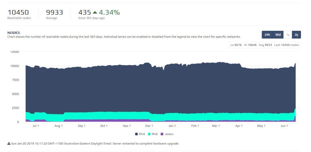 而全节点的数量呢?也有大概一万,差不多是活跃地址的 1%。