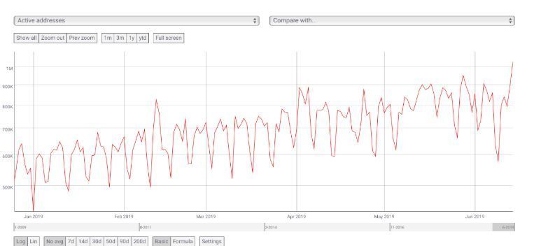 2019 年 6 月的数据显示,比特币的活跃地址在 100 万左右。