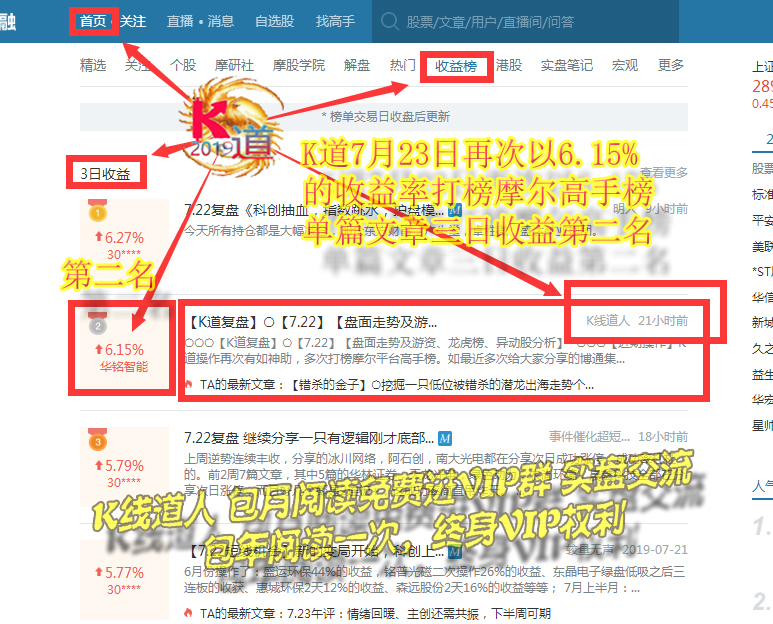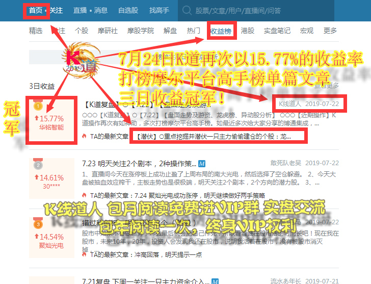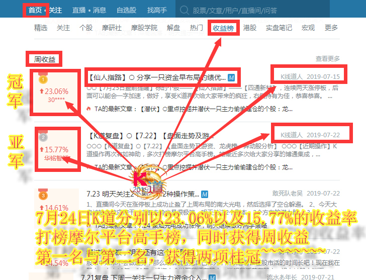 K道7月24日,在大盘如此不堪行情如此难做的市场下,同一天获得三个高手榜冠军排名,实属不易!以文章《【仙人指路】 分享一只资金早布局的绩优个股:底部金叉+平台突破》标的个股【仙人指路】23.06%的收益率打榜摩尔平台高手榜周收益第一名,同时另一篇文章分享的华铭智能以15.77%的收益率获得周收益第二名,斩获周收益前两位!于此同时,以复盘文章标的个股——华铭智能15.77%的收益率打榜摩尔平台高手榜单篇文章三日收益第一名!有图有真相!