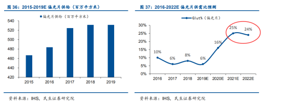 2020年将是全球偏光片供需比从紧平衡转为充足的转折点;预计到 2022 年10 条新增偏光片生产线投产,将促使偏光片产能超过需求的 24%,转为产能过剩。
