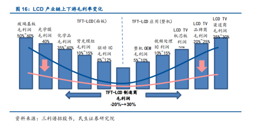 偏光片制造加工利润约 20-30%,成本约占液晶面板的 10%,其毛利率受到上游部分原材料垄断的制约和下游面板厂利润的挤压,产业链利润水平呈现著名的“微笑曲线”。