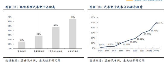 而汽车电子占比电动车高于传统燃油车。在纯电动车型中,汽车电子占比达到 65%,