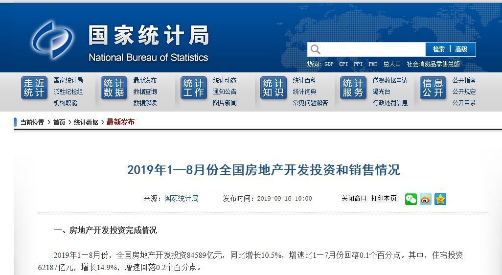 2019年1—8月份,全国房地产开发投资84589亿元,同比增长10.5%,增速比1—7月份回落0.1个百分点。