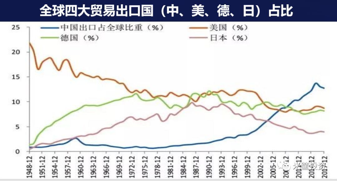 单列数据大家可能感受的不太直观,如果把我们建国以来,中美德日四个国家的贸易出口占比放在一起做个对比,可能给大家的震撼感更加强烈。