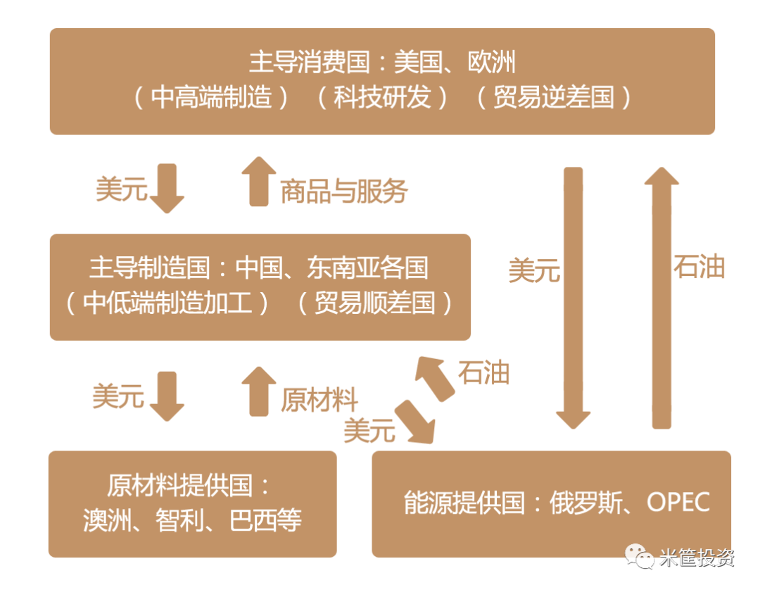 在这个架构中,大家各司其职,欧美发达国家负责全球消费需求主导、中高端制造,高科技研发,主导消费。