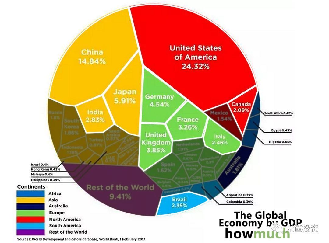 中国的经济经过高速发展,2018年底经济总体量已经高达90万亿人民币。我们在世界的经济份额占比越来越高,接近15%,而美国占比24.3%。