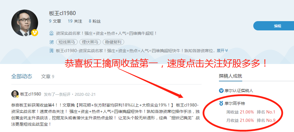 恭喜板王斩获周收益第一,速度点击关注擒涨停!近期文章擒【同花顺+东方财富均获利20%以上+太极实业31%+长电科技10%!】 狙击热点板块龙头+游资抢筹起爆金牛=板王擒牛战法,最新好股已经锁定,速度订阅完美起涨机会!最新锁定芯片补涨龙头+游资强力介入+底部倍量伏击,蠢蠢欲动完美低吸机会,铁粉抓紧跟上板王!