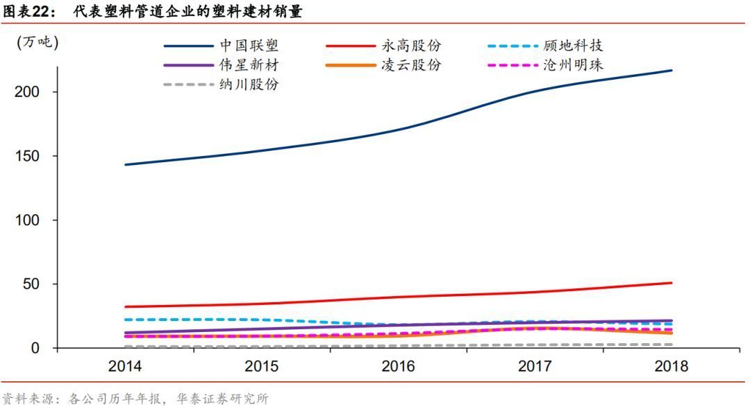 从销量上看,公司塑业管道业务销售量逐年增长,2012年时约22.97万吨,2018年达到了50.86万吨。据悉,截止目前,公司年生产能力在60万吨以上,其中PVC产品约40万吨、PE产品约15万吨、PPR产品约5万吨。