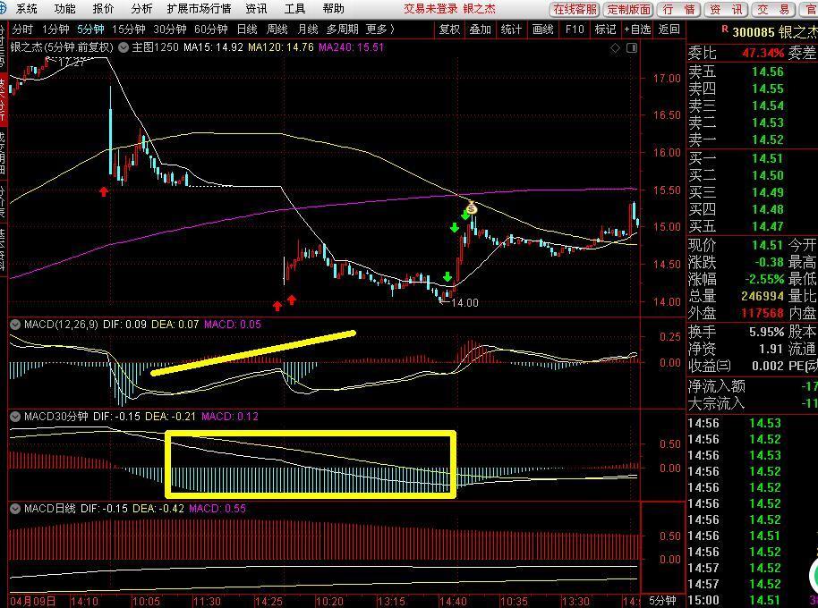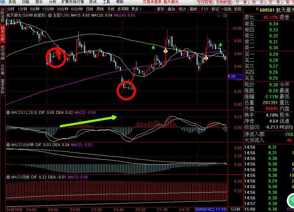 2:回顾实盘操作,600501 航天晨光在4月10日,以9.63元首次买入500股,之后在收盘前以9.37元加仓600股后,平均成本摊低到9.52元1100股,次日以9.52元为基准下跌5% 在9.05元 加仓1100股后, 当日在9.55元冲销掉,在周二 股价上冲到9.9元 回落后,股价跌破5分钟120线,在9.60元出掉,本次操作盈利600元