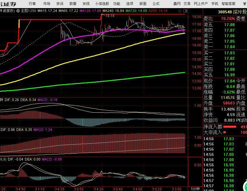 5:昨天以17.13元随机入市后,今天在17.13元下跌3%的价格16.61元买入200股后 ,在17.56元当日冲销掉仓位,当前的5分钟120 250均线,当前尚可以持股 ,当前的价格距离15天均线还有18%的差价,所以明天在16.61元委托买入200股,15.78元委托买入400股,14.95元委托买入500股,在日线macd指标红色柱子的前提下,可以越跌越买