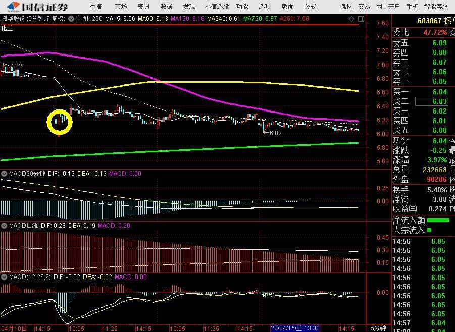 4:603067振华股份,在日线macd指标金叉后的第一次30分钟macd指标死叉后,在6.24元买入,之后股价并没有如期反弹,5分钟120线死叉250线,这个股票可能做错了,明天以6.24元下跌5%的价格再次接单,然后尽量保持不亏钱,然后出局