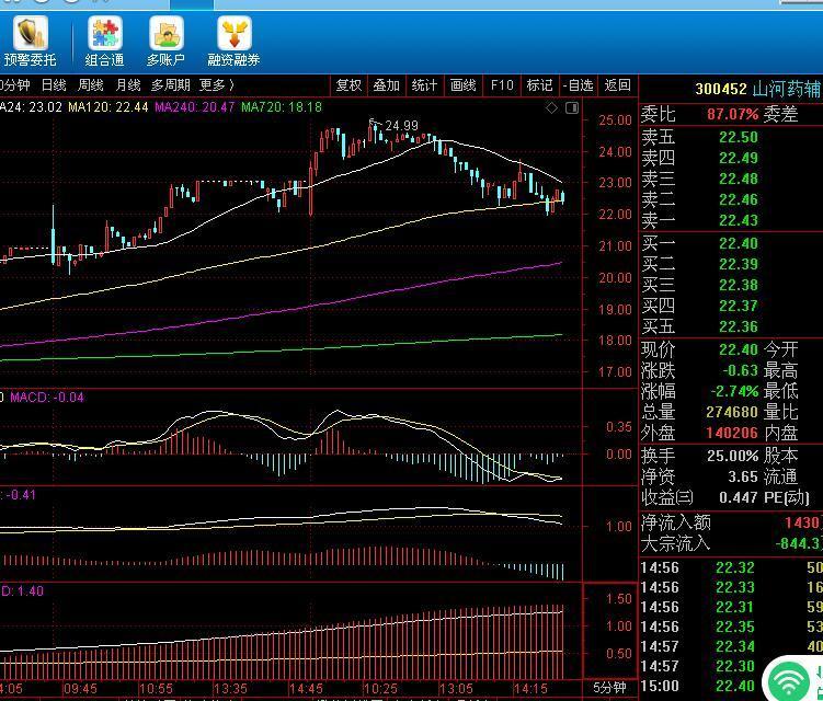 6:今天早盘的时候,选出3个股票 300452山河药辅,603991至正股份,600079 ,早盘以22元委托买入300452,结果直接冲高,后取消买单,当日是一个放量长上影线的k线,但是5分钟120 250均线多头排列,所以这个股票并没有 一下就完蛋,还会反复