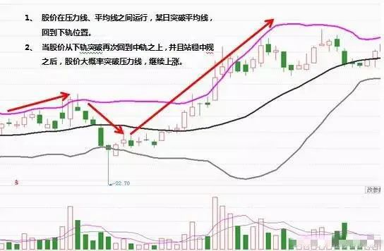 如图,股价走势处于震荡或者缓慢上行的走势中,处于平行窄轨的中轨和上轨之间;在某日跌跌破中轨,回到下轨位置,随后震荡几天后,突破中轨直至上轨;再次重复之前的操作回调中轨站稳后,此时发生向上突破上轨的走势概率非常大,这是比较常见的挖坑形态。
