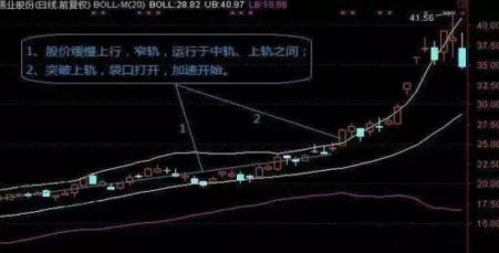 2、股价横盘震荡或缓慢上行,BOLL呈现平行窄轨,股价运行在BOLL中轨和上轨之间,某天突然加速,突破了上轨 ,BOLL的袋口(上下轨)也呈现打开的态势,这时发生行情的概率较大。这是经典的加速上涨形态: