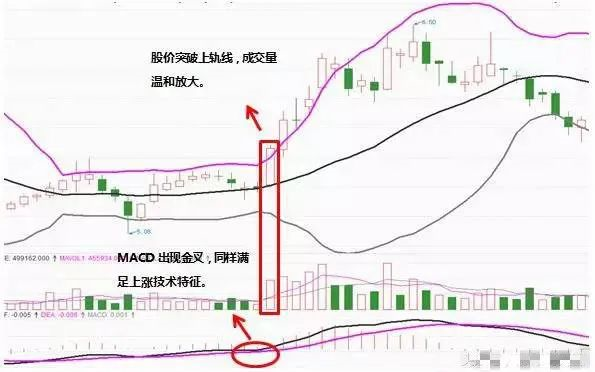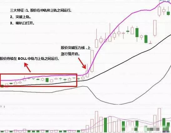 1、股价维持在上轨线和中轨线之间运行,当股价突破上轨线时,开口放大。