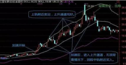 4、对于上面说的这三种刚进入加速后的股票,尖顶回落中轨,通常都是买入机会,之后至少会有一次上攻,上攻的力度较强,能够再次攻击山鬼,就构成上升通道,回落中轨都可以再次买;力度弱,构成了背离,这时候就要出局了。这是在上升通道做强势股的方法:
