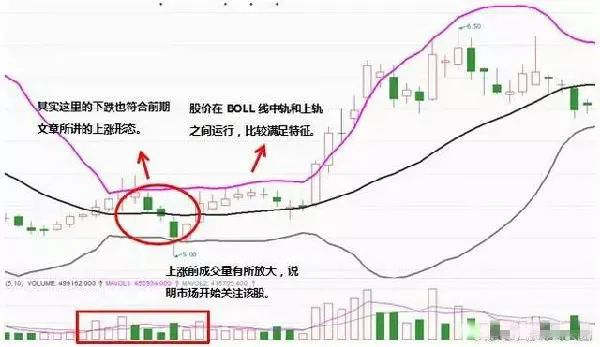 3、之前就经过一波大涨,BOLL袋口也呈现打开状态,当OBLL收口时,股价从中轨下方穿越上来,这时候可能会发生新的行情。这是经典的逐浪上攻形态: