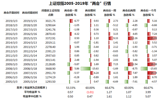 2、2005-2019年来两会前后和会议期间的上证指数涨跌幅表