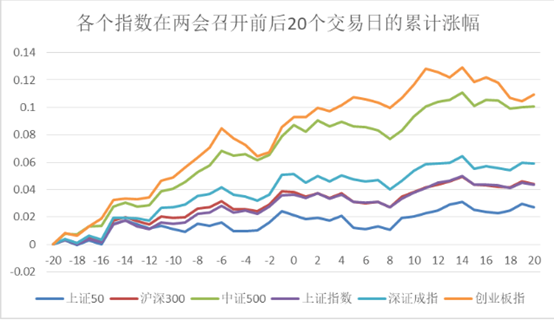 首先我们来看看,2010年至2019年这十年间,上证50、沪深300、中证500、上证综指、深证成指和创业板指数在两会召开前后20个交易日累加收益率的平均值情况。创业板指数因为2010年5月才发布,所以创业板指数计算的时间范围是2011年至2019年。