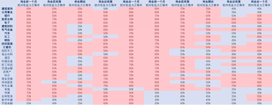 从行业板块来看,在两会前一月至两会期间,医药生物板块表现尤为突出,跑赢上证综指的概率为90%;而在两会后一个月内,有色金属板块收益率超过上证综指的概率为80%,保持领涨态势。