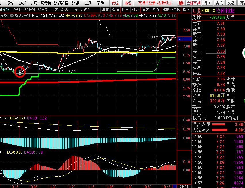 这 是603993的五分钟图,黄色线是15天线,折合30分钟120线,红色是30分钟480线,大概是60天线,如果你要操作的话,看好止损点,当下日线macd指标刚刚要金叉的样子,短线暂时把5天低点,6.66元作为止损位置,如果股价上去了, 赚5到10个点以,可以加仓或者在其他同形态的股票上开新仓