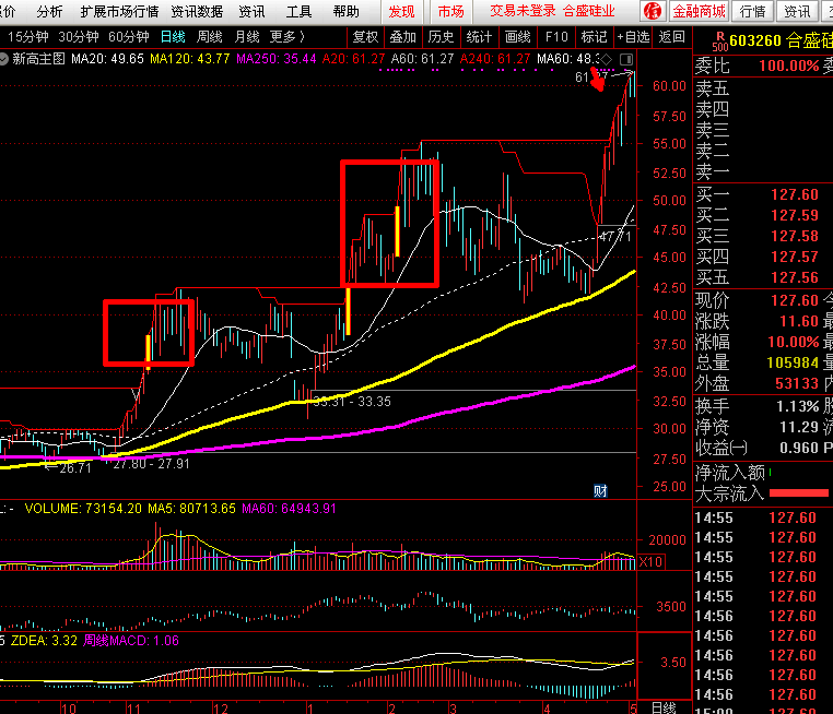 603260 在炒作有机硅的时候选出来过,当时选中他的理由的就是业绩好,题材还可以,均线系统120/250 大均线火车轨,逆势强于大盘,但是最后因为当时的流通市值在500多亿,感觉有点未来上涨可能有难度就放弃了,