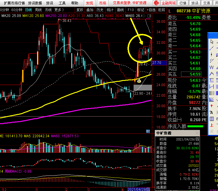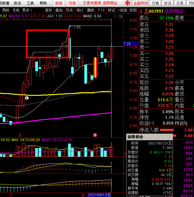 002532 大概120亿,我下周想把603993 洛阳钼业补回来,在洛阳牧业上做了三次都是赚钱的,当下洛阳牧业的位置是周线macd指标金叉后的第一次日线macd指标死叉后再次金叉的位置