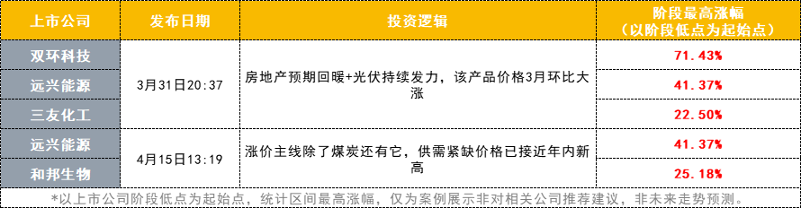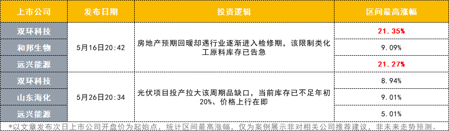 以文章发布次日开盘价为起点,统计5月栏目覆盖纯碱行业个股区间最高涨幅,其中双环科技、远兴能源半月以来已涨超20%。而26日晚间覆盖的中国海化则在次日强势拉升触及涨停。