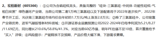 5月23日20:35《风口研报·公司》发布文章覆盖宏柏新材,公司是含硫硅烷龙头,具备完整的“硅块-三氯氢硅-中间体-功能性硅烷-气相白炭黑”绿色循环产业链,当前公司第二套5万吨三氯氢硅以及下游配套将于2022年逐步投产,届时产能将翻倍。