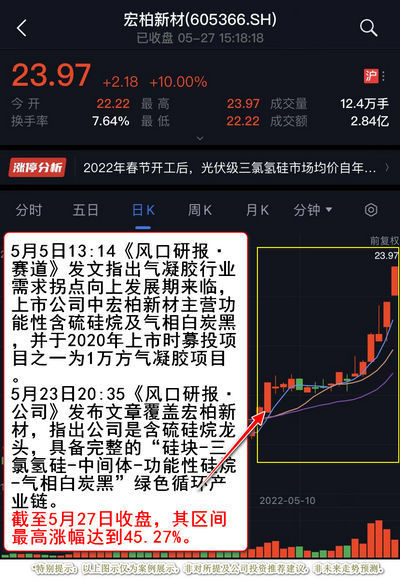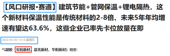 5月初,栏目曾发文覆盖宏柏新材,区别于此次“三氯氢硅”看点,5月5日13:14《风口研报·赛道》发文则是以“气凝胶”赛道为切入点对宏柏新材展开解读。
