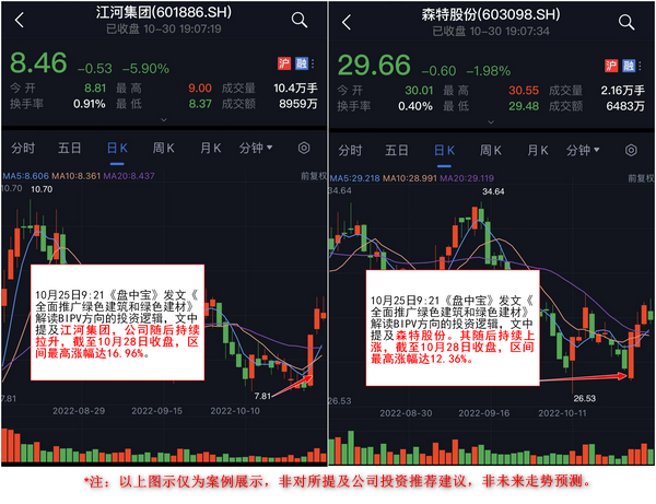 《盘中先手》在近期结合市场资讯,精选了多家券商分析师的观点,深入浅出地点评了光储、基建等潜力产业的投资逻辑。如10月25日9:21《盘中先手》发文《全面推广绿色建筑和绿色建材》解读BIPV方向的投资逻辑。消息面上,多部门发文推动北京市朝阳区等48个市(市辖区)实施政府采购支持绿色建材促进建筑品质提升政策,到2025年实现政府采购工程项目政策实施的全覆盖。